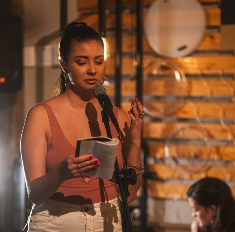 Mi camino en los recitales poéticos comenzó en 2017, con la creación de Verso y Beso, un poemario íntimo y honesto que abrió la puerta a mi voz en escena. Desde entonces, participé en diversos espacios como open mics, eventos culturales y diplomáticos, incluyendo presentaciones organizadas por embajadas como la de Bolivia, y otros encuentros de poesía y arte.
